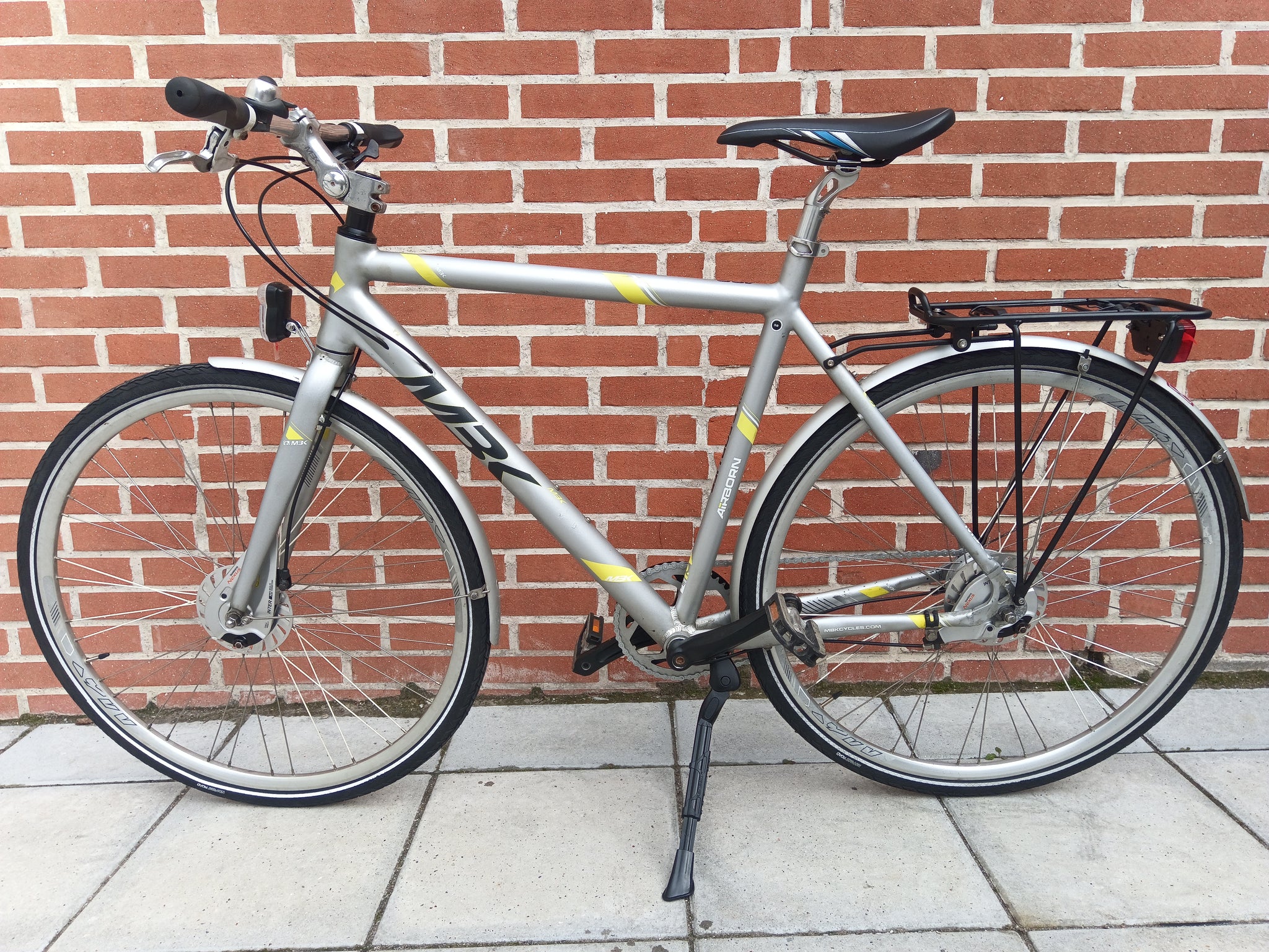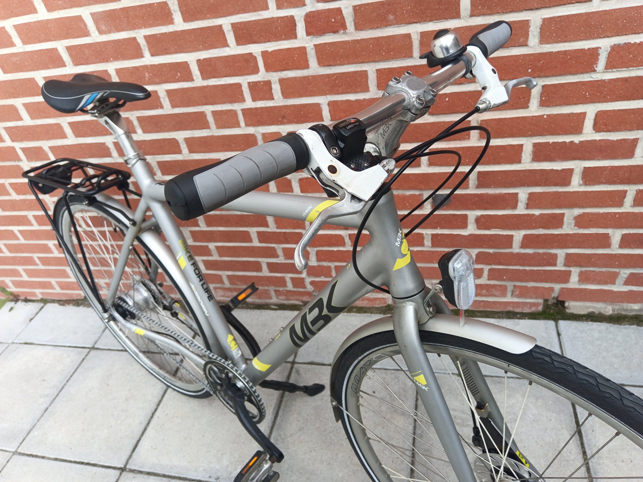 Fully equipped with bell, rear carrier, mudguards, kickstand, and mounted lights.