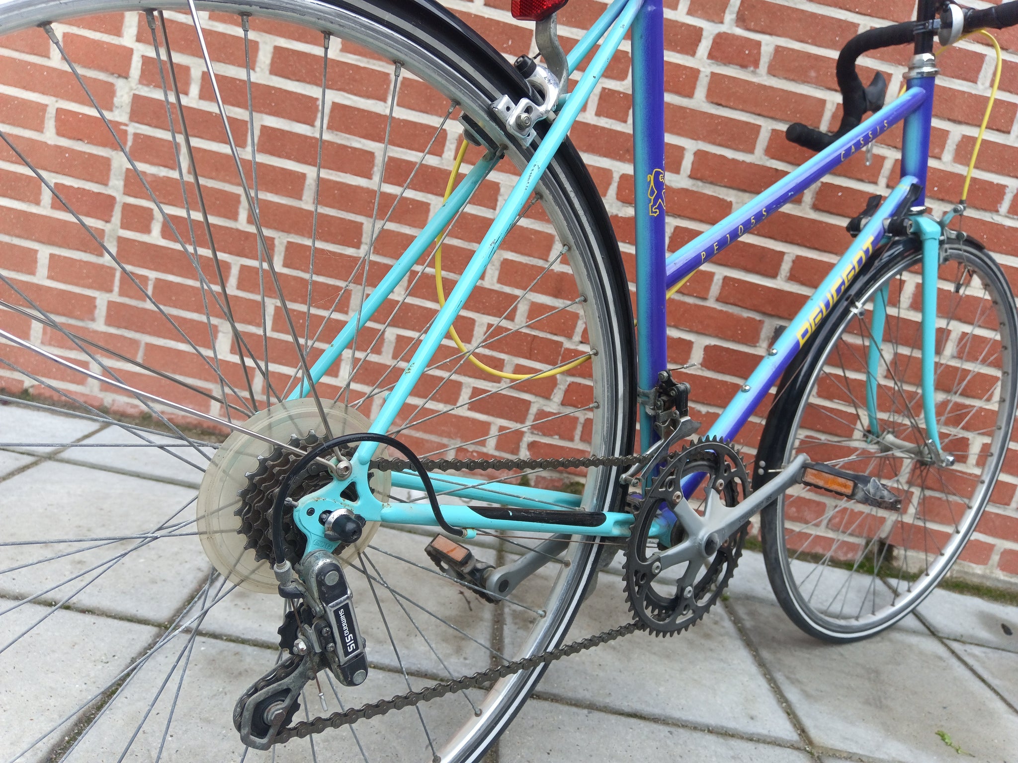 Vintage steel Peugeot road bike converted for city use — elegant, lightweight, and fast.